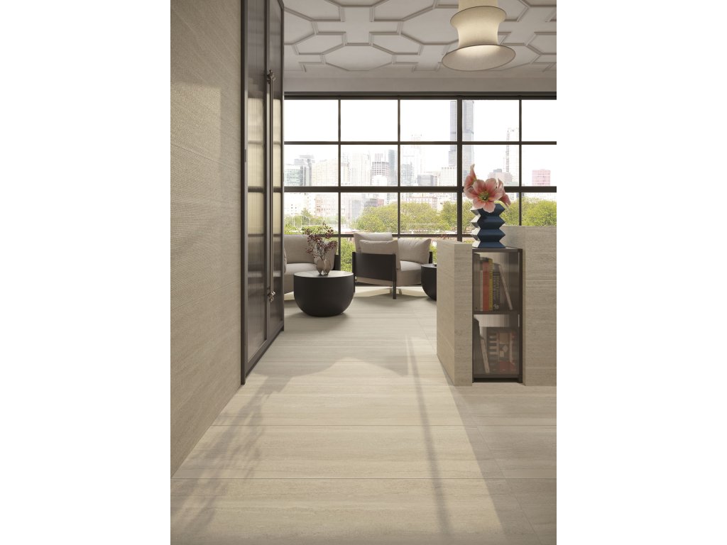 Dekor inspirovaný přírodním kamenem a jemným žilkováním vytváří harmonický a vyvážený vzhled, který se skvěle doplňuje s dřevěnými, kovovými či betonovými prvky. Světlý béžový tón navíc opticky rozšiřuje prostor a dodává mu klid a světlo.